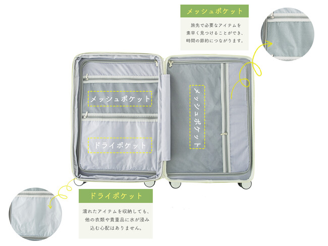 荷物が増えても安心、収納ポケットで整理整頓も簡単です。メッシュポケットで荷物がどこにあるか一目瞭然、ドライポケットには濡れたアイテムを入れても水が染み込む心配なし。細部にまでこだわった収納です。
