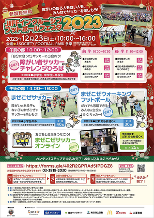 一般社団法人日本障がい者サッカー連盟(JIFF/会長:北澤豪)は、2023年12月23日(土)にJ-SOCIETY FOOTBALL PARK 多摩(東京都多摩市)およびオンラインで「JIFFインクルーシブフットボールフェスタ2023」を開催します。本イベントは、”障がいの有無に関わらず混ざり合える共生社会の実現に向け、サッカーを通じて障がい児・者と健常児・者の相互理解の機会をつくる”ことを目的に、JIFFが設立された初年度(2016年)から毎年12月に開催し、今回で8回目となります。今年度は障がいのある子どもと障がい者サッカーとの出会いの機会を創出し、障がい特性や程度に応じて楽しめるサッカーを見つける「障がい者サッカーチャレンジひろば」を新たなプログラムとして実施し、これまでよりさらにパワーアップしたイベント内容となっています。