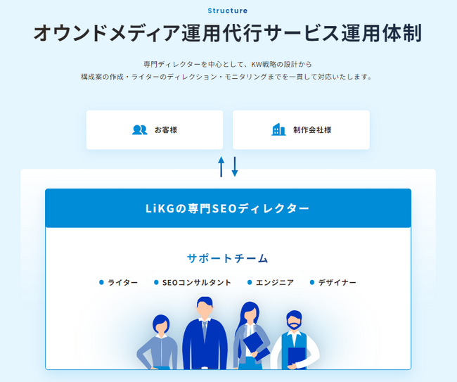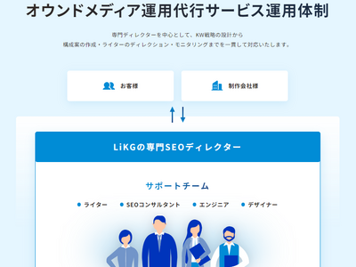 BtoCビジネスに強いSEO対策支援を行う株式会社LiKG(リク)が、オウンドメディア運用代行サービスを正式リリースしました。様々な環境で経験を積んだ、優秀なITフリーランスとの独自のネットワークを形成しており、お客様の課題感・ニーズに合わせた独自の運用チームを構築し、マーケティング成果を最大化させます。