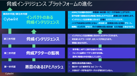 サイバーセキュリティに対するサイバーイントの最新のアプローチは、従来型(第一世代型から第三世代型)のベンダーとは一線を画しています。多くのサイバーセキュリティプロバイダーが脅威インテリジェンスデータを提供していますが、その情報源は主にIoC(indicator of compromise)やOSINT(open-source intelligence)データポイントから構成されているため、完全なビューを提示できるプロバイダーはほとんどありません。それとは対照的に、サイバーイントはダークウェブ・フォーラムやソーシャルメディア・プラットフォームなど、収集する脅威インテリジェンス・ソースの数を継続的に拡大し、コンテキストの理解を深め、脅威に対するより深い洞察を得ています。