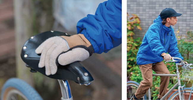 ・自転車のハンドルをしっかり握れる滑り止め付き。手首をカバーする長さで、袖口からの冷気の侵入を防ぐ。