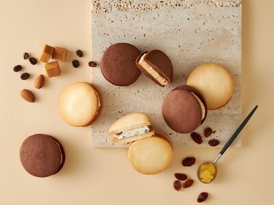 「ラムレーズン&アップルプレザーブ」は、しっとりとした質感のプレーンクッキーに、芳醇なラムレーズンと青森県産のシロップ漬けりんごを贅沢に忍ばせたクリームをサンド。「キャラメルコーヒー&アーモンドプラリネ」は、サクサク歯切れ良いココア味クッキーに、ふんわり甘くほろ苦いコーヒー風味&カリっと香ばしいアーモンドプラリネの入ったクリームをサンドしました。
