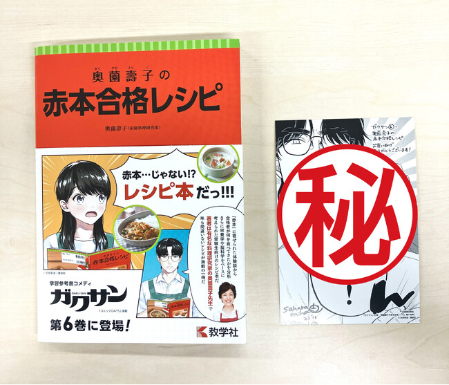 さらに、第50話を収載した『ガクサン』第6巻が発売になるのに合わせて、『奥薗壽子の赤本合格レシピ』または『ガクサン』第6巻いずれかのご購入で、佐原実波先生描き下ろしのイラストカード(数量限定)がもらえるキャンペーンを実施いたします。