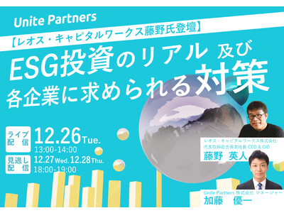 企業の変革パートナーを目指すブティック型コンサルティングファームのUnite Partners株式会社(本社:東京都、代表取締役:小林大輝)は、2023年12/26~28 に、「【レオス・キャピタルワークス藤野氏登壇】ESG投資のリアル 及び 各企業に求められる対策」と題して大企業の経営幹部の方向けのセミナーを開催します。