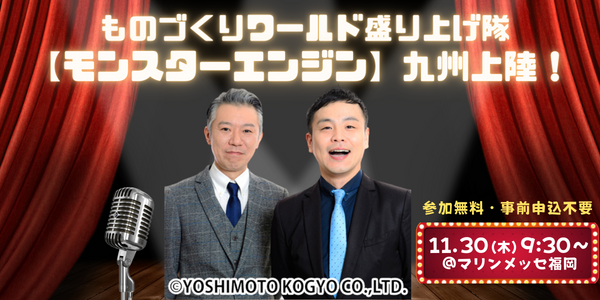製造業界とも縁が深いモンスターエンジンが、九州初開催となる「ものづくりワールド」開催2日目のオープニングイベントに登場。漫才やトーク、クイズ大会で会場を盛り上げる。