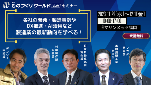 日産自動車九州/ホンダ熊本/村田製作所/マツダ/デンソー/三菱重工業/ソニー/富士通等が登壇!「DX推進」「AI活用」「開発・製造事例」「ロケット開発」「サプライチェーンDX」など、課題に合わせて学べる無料セミナーを毎日開催。事前申込制のため、気になるセミナーはお早めにお申込みください!