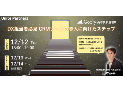 企業の変革パートナーを目指すブティック型コンサルティングファームのUnite Partners株式会社(本社:東京都、代表取締役:小林大輝)は、2023年12/12~14 に、「【Goofy山本代表登壇】DX担当者必見!CRMツールの導入に向けたステップ」と題して大企業のDX担当者向けのセミナーを開催します。
