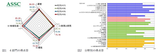 ASSCは、2013年に北海道大学サステイナブルキャンパスマネジメント本部が開発したアンケート形式の評価システムで、運営部門、環境部門、教育と研究部門、地域社会部門の4部門からなり、その下に合計170個の評価基準が配置されています。評価の結果、4段階のレートのうち、上位2つに当たるプラチナまたはゴールドを獲得した機関が、サステイナブルキャンパスを推進する機関と認定され、認定証が交付されます。認定の有効期間は3年間です。