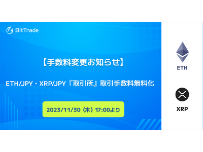 ビットトレード株式会社(所在地:東京都港区、代表取締役社長:関 磊、以下「ビットトレード」)は、2023年11月30日(木)17:00より、 ETH/JPY・XRP/JPYの“取引所”取引手数料を無料にいたします。