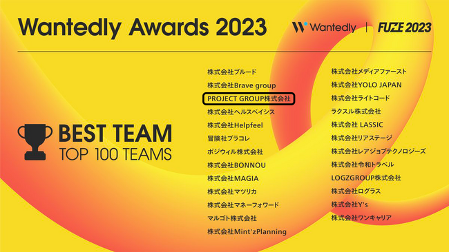 この度、PROJECT GROUP株式会社(本社:東京都千代田区、代表取締役:田内広平、以下「PROJECT GROUP」)は、ウォンテッドリー株式会社の「Wantedly Awards 2023」において、約42,000社の中からBEST TEAM部門 TOP100に選出されたことをお知らせいたします。