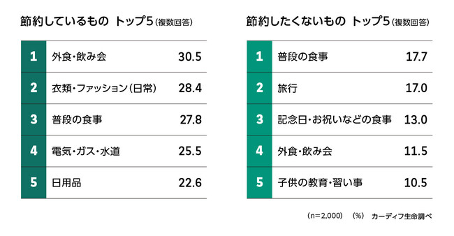 一方で、「節約したくないもの」のトップは「普段の食事」(18%)、次いで「旅行」(17%)、「記念日・お祝いなどの食事」(13%)。「普段の食事」は、「節約しているもの」「節約したくないもの」のいずれにおいても上位にあり、本当は節約したくはないが、やむなく実施している生活者の実態がうかがえた(図表1-2)。
