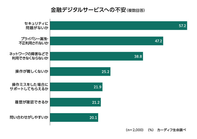 金融デジタルサービスの利用が浸透している一方で、「セキュリティ」(57%)や「プライバシー漏洩・不正利用」(47%)、「ネットワーク障害」(39%)に不安を感じている人が多かった(図表3-2)。