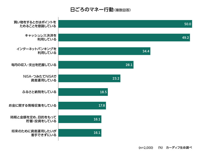 日ごろのマネー行動では、「買い物でポイントをためることを意識している(ポイ活など)」(50%)が最も多く、次いで、「キャッシュレス決済を利用」(49%)、「インターネットバンキングを利用」(34%)となった(図表2-1)。