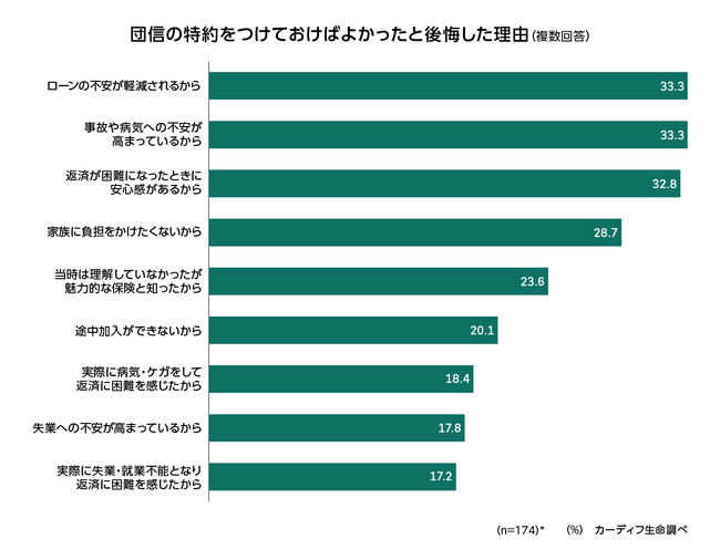 団信の特約を付けずに後悔した理由として、「ローンの不安が軽減されるから」(33%)、「事故や病気の不安が高まっているから」(33%)、「返済が困難になったときの安心感があるから」(33%)など挙げられた。また「実際に病気・ケガをして返済に困難を感じたから」(18%)、「実際に失業・就業不能となり返済に困難を感じたから」(17%)など、住宅購入後に病気やケガ、失業などによりローン返済に困難を感じた経験から、団信の特約の必要性を再認識した人も多くみられた(図表6-2)。