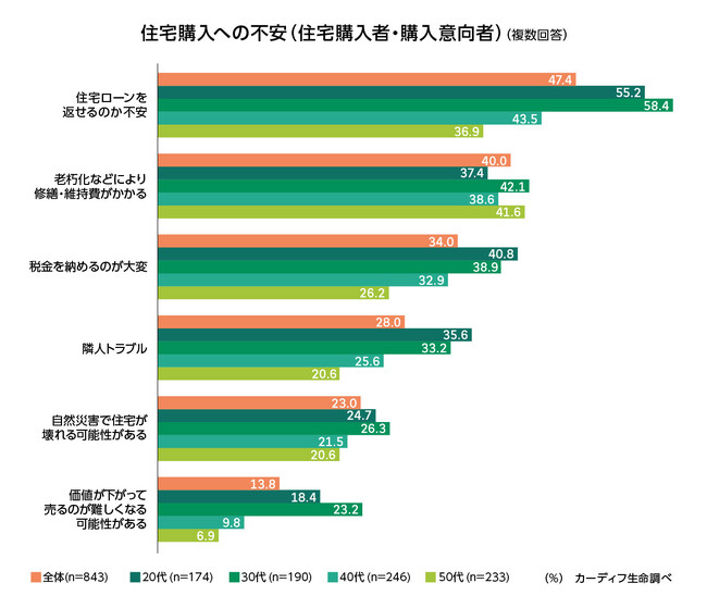一方で、住宅購入への不安理由トップは「住宅ローン返済への不安」(47%)。特に20代・30代は全体の半数以上が住宅ローン返済に不安を感じている(20代 55%、30代 58%)(図表4-2)。