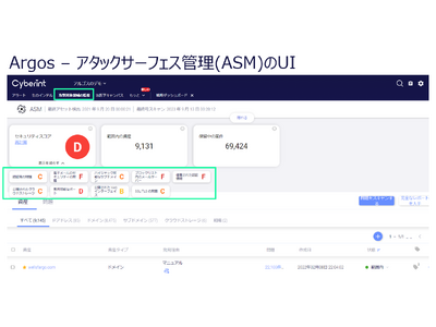 アタックサーフェス管理と脅威インテリジェンスを単一のプラットフォームで提供するサイバーイントのアルゴス プラットフォームのユーザーインターフェースの一部 :
