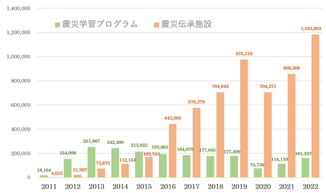 震災学習プログラム受け入れ人数は、2013年のピークから徐々に下降後、コロナ禍で激減。2022年にかけて増加したものの、コロナ前の2019年比で9割。