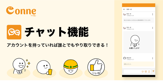 現場クラウドConneは、会社・現場・協力会社の情報共有を円滑にし、現場に関わる皆様の負担軽減はもちろん、コミュニケーションの活性化にもつながる建設業向けのクラウドサービスです。機能の多さよりも誰でも使えるシンプルさを重視しています。お客様満足度は94%以上。徹底したサポート体制により、「パソコンが苦手な人まで使ってもらえるようになった」「現場同士のコミュニケーションが活性化された」など、全国の施工会社様や現場の職人の方から喜びの声をいただいています。この度、現場クラウドConneは、より便利なサービスを目指し新機能『チャット機能』をリリース致しました。
