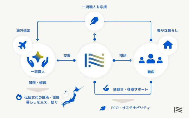 長い時間を経て育み、継承されてきた日本の伝統工芸文化は今、少子高齢化や東京一極集中などの理由により消滅の危機に晒されています。当社はこの文化を維持・継承することで、日本の誇りを守ると同時に、新たなエコシステムを形成し、国内外で更なる発展を遂げるための事業に挑戦しています。