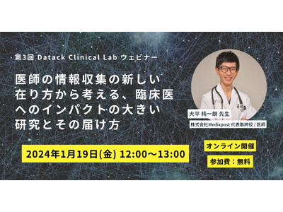 株式会社データック(東京都千代田区、代表取締役兼医師 :二宮 英樹、以下:データック)は、第3回 Datack Clinical Lab ウェビナー「医師の情報収集の新しい在り方から考える、臨床医へのインパクトが大きい研究とその届け方」と題した無料オンラインセミナーを、2024年1月19日(金)12時より開催いたします。