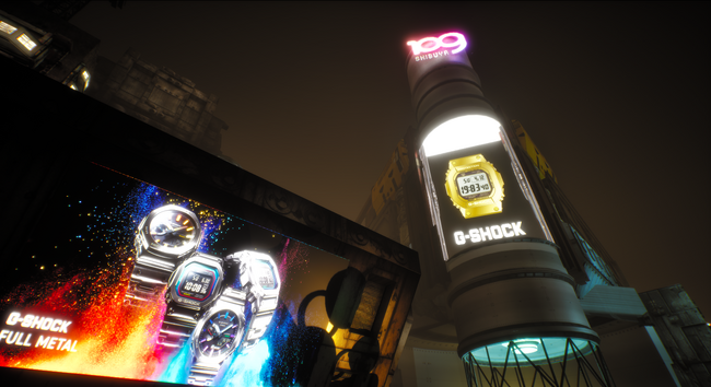 ゲームマップ内に造られた建物の外壁など様々な場所へメタバース広告を設置することが可能です。本マップ公開のタイミングでは、カシオ計算機株式会社(本社:東京都渋谷区、代表取締役社長CEO兼CHRO:増田 裕一)の「G-SHOCK」の広告を掲出しています。今後、メタバース広告と現実世界の広告とを連動させたデジタルツイン広告や、店舗と連動したプロモーション等も展開予定です。