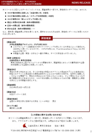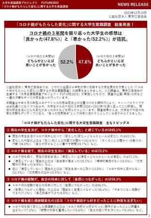 公益社団法人 東京広告協会では、このたび全国の4年制大学に在籍する大学生男女を対象とした『「コロナ禍がもたらした変化」に関する大学生意識調査』の結果をまとめました。この調査は、東京広告協会が主催する「大学生意識調査プロジェクト FUTURE2023」が実施したもので、調査の企画・実施・分析など一連の作業をすべて大学生自らが行っています。