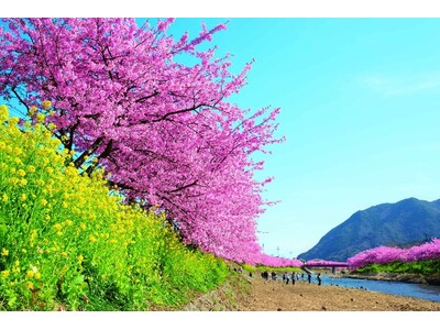 「河津桜」の誕生の地である静岡県賀茂郡河津町で開催される「河津桜まつり」は、毎年、全国からたくさんの観光客が集まる伊豆の一大イベント。町内を流れる河津川沿いに植えられた約850本の河津桜が咲き乱れ、同じ時期に川沿いに植えられた菜の花も開花。河津桜の濃いピンク色と、菜の花の黄色の花との共演は、訪れる人の心を魅了します。