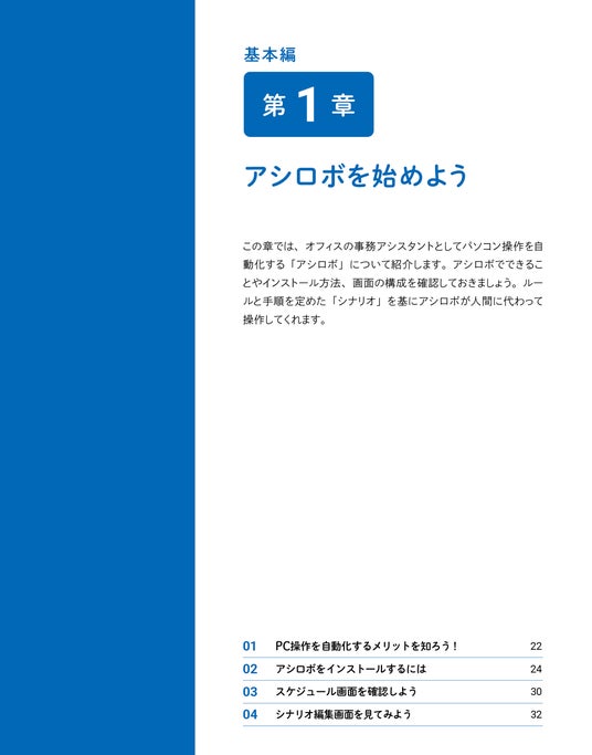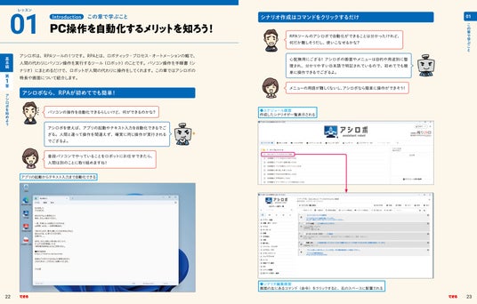 アプリの自動起動をはじめ、文書の書式を自動で変更する方法、Excelのセルに自動で値を入力する方法など、アシロボの操作と使いこなしのコツを、基本からステップごとに、シナリオの作成方法を習得できます。
