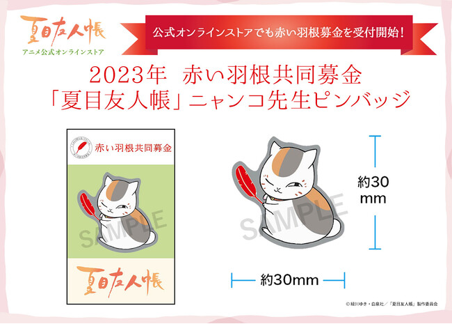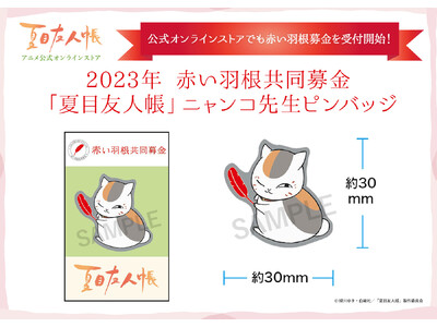 BEENOS株式会社(東証プライム:3328)の連結子会社で、エンターテインメント産業のデジタルトランスフォーメーション(DX)を支援するBEENOS Entertainment株式会社(本社:東京都品川区、代表取締役社長:玉谷 芳和)は、株式会社ADKエモーションズ(本社:東京都港区、代表取締役社長:野田 孝寛)が運営する今年15周年を迎えた人気アニメ「夏目友人帳」の公式グッズを販売するショッピングサイト『夏目友人帳 アニメ公式オンラインストア https://natsume-animestore.jp 』にて、地域福祉の推進を行う「赤い羽根共同募金」『2023年 赤い羽根「夏目友人帳」ニャンコ先生ピンバッジ』の取り扱いを、12月25日(月)11時より数量限定で開始します。募金として寄せられた寄付は子どもたち、高齢者、障がい者の方々などを支援させていただく、さまざまな福祉活動や災害時支援に役立てられます。