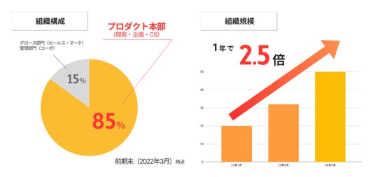 昨年は、プロダクトの開発や導入支援のサービス強化に注力していました。そのため、前期末時点では、プロダクト本部(開発・企画・CS)の人員が組織全体の85%を占めていました。今期は事業の急成長に伴い、組織規模はこの9ヶ月で倍増しています。今期末には前年同月比2.5倍になる見込みです。
