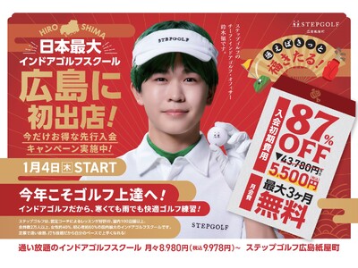 全国に100店舗を超えるインドアゴルフスクールを運営するステップゴルフ株式会社(本社:東京都千代田区、代表取締役:榎本考修)は、2024年4月1日に広島県に初出店する『STEPGOLF 広島 紙屋町』の先行入会受付を2024年1月4日(木)より開始しました。
