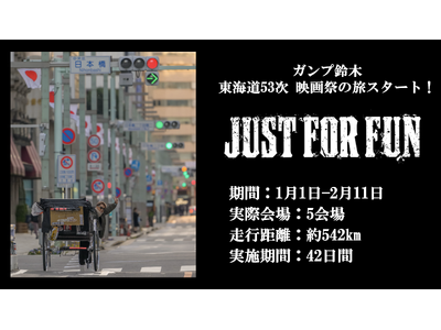 人力車で世界を走るガンプ鈴木は、今回、1月1日~2月11日に自身のドキュメンタリー映画「JUST FOR FUN - 一期一会。人生を走り続ける男の物語。」東海道での公開に際して東海道53次映画祭の旅をスタートしました。今回の映画祭は『静岡・愛知(2会場)・京都・大阪』の全5会場で上映されます。
