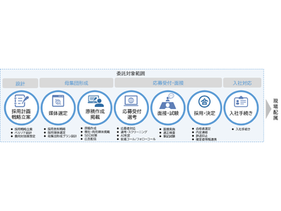 本サービスは、2023年4月より当社内の業務で運用しているAI予測モデル「業務マッチング型採用モデル※1」を活用したAIによるヒトと業務との最適なマッチングのほか、採用専門人材によるコンサルティング役務の提供に基づく、採用戦略の立案から、計画設定、選考、入社手続きといった採用プロセスを一気通貫で担うものです。