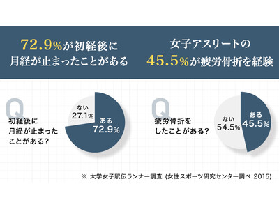 近年、女子アスリートが世界を舞台に目覚ましい活躍をしていますが、その裏側には、健康問題を抱えながらトレーニングに励み、体調管理においてサポートを必要とする女子アスリートの実態があります。実際に、下図にあるように、月経が止まったことがある【72.9%】、疲労骨折を経験したことがある【45.5%】と報告されています。