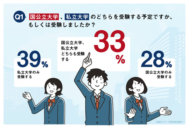 なお、今回の調査対象である2024年度入試受験生および大学受験経験者 全体での割合は、「国公立大学、私立大学どちらも受験」33%「国公立大学のみ受験」28%「私立大学のみ受験」39%。