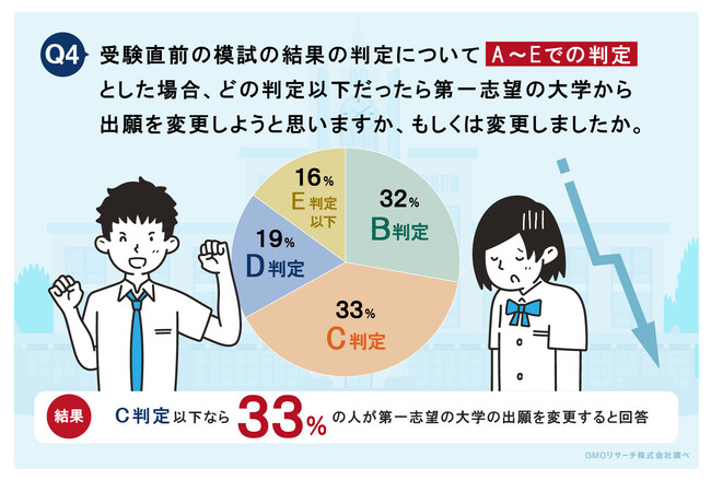 【設問】「受験直近の模試の結果の判定についてA~Eでの判定とした場合、どの判定以下だったら第一志望の大学から出願を変更しようと思いますか。」【SA(単一回答)】