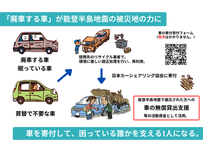 日本カーシェアリング協会は、廃車する車の提供を通じた募金を全国から募り、その募金額を活動財源として能登半島地震で被災された方への車の無償貸出支援を推進していきます。