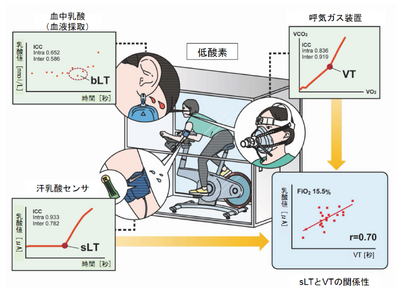 運動は万病の薬といわれ、病気の有無に関わらず健康を維持するために重要です。近年、低酸素トレーニング(注2)が、より低負荷で効率的なトレーニングができると認識され、都市部を中心に、トレーニングジム等にも低酸素環境のトレーニング室が併設されるようになってきています。低酸素トレーニングはアスリートの持久力の向上にも寄与されることが期待されていますが、従来行われてきた高地での低酸素トレーニングは身体の健康に与える影響も少なくなく、地上に作り出した低酸素環境下でのトレーニングがトレンドとなりつつあります。低酸素トレーニングにおける負荷設定や効果判定には低酸素環境下で持久力の指標となる嫌気性代謝閾値(Anaerobic Threshold, AT)を計測することが有用であると考えられ、これまでは呼気ガス分析装置を用いた解析による換気性作業閾値(Ventilation Threshold, VT)が ATの代表的な指標として用いられてきました。しかし、VTの計測には高額で大掛かりな装置が必要であり、解析には専門的な知識を要するため、広く運動愛好者・アスリートに対して適用することが出来る、より簡便なAT指標の計測手法が必要とされてきました。そこで本研究グループは、近年、ATの新たな指標として、常酸素環境下では妥当性が認められた汗乳酸性閾値(Sweat Lactate Threshold, sLT)の計測手法を低酸素環境へ応用し、その評価手法の有用性を検証した結果、低酸素環境においてもsLTがATの指標として高い信頼性・妥当性を有していることを明らかにしました。