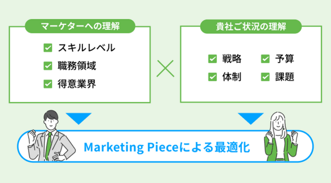 Marketing Pieceは、経験豊富なプロのマーケターとマーケティング課題をお持ちの企業を業務委託契約でマッチングするサービスです。CMOクラスのトップマーケターが企業の戦略や組織体制などのご状況を深く理解し、ご状況に最適なマーケターをご提案いたします。これにより従来マーケター採用の課題として存在していた「マーケター採用のミスマッチ」を防ぎ、効率性の高いマーケティング組織構築や売上改善に導きます。