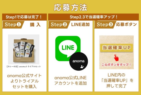 - anoma公式オンラインショップにて「 【カレーの日】anomaプロテイン トライアルセット 」を購入で応募は完了!