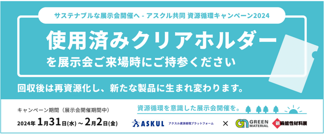 また、サステナブルな展示会開催の取組の一環として、会場ではアスクル資源循環プラットフォームを通して来場者よりクリアホルダーの回収を行います。 展示会を挙げてマテリアルリサイクルを推進いたします。