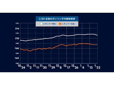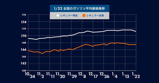 1月22(月) 時点のレギュラーガソリンの全国平均は、171.2円となり先週から0.4円の値下がり。2週間ぶりの値下がりとなりました。