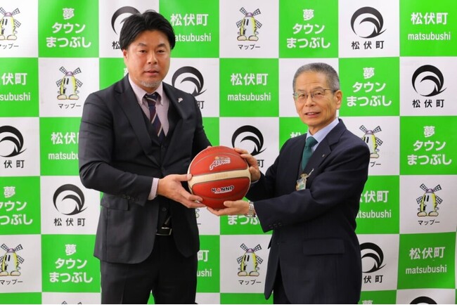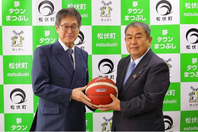 株式会社菅野福島商事代表取締役大塚節子様にもご出席いただき、松伏町の鈴木勝町長、岡田直人教育長にバスケットボールをお渡し致しました。