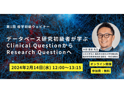株式会社データック(東京都千代田区、代表取締役兼医師 :二宮 英樹、以下:データック)は、第1回疫学初級ウェビナー「データベース研究初級者が学ぶClinical QuestionからResearch Questionへ」と題した無料オンラインセミナーを、2024年2月14日(水) 12時より開催いたします。