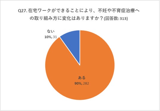 在宅ワークができることにより、不妊や不育症治療への取り組み方に変化が「ある」人は90%、「ない」人は10%であった(Q27)。