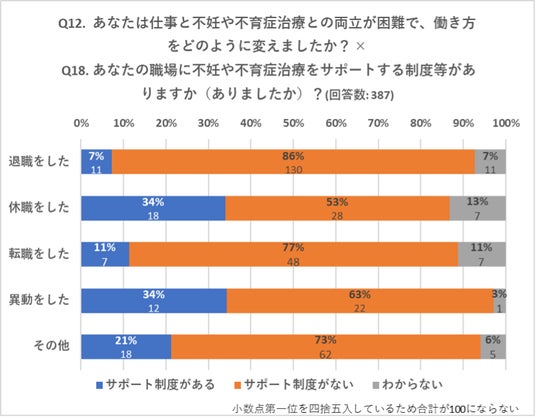 職場に不妊や不育症治療をサポートする制度があると、「異動」や「休職」を選択はともに34%で、「退職」(7%)や「転職」(11%)より多い(Q12×Q18)。