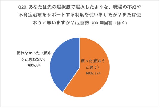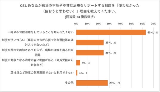 職場に不妊や不育症治療をサポートする制度等があっても「使った(使おうと思う)」人は60%(Q20)。「使わなかった(使おうと思わない)」(40%)と回答した人の理由の中では、「不妊や不育症治療をしていることを知られたくない」(63%)が最も多かった(Q21)。(図14~図18参照)