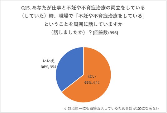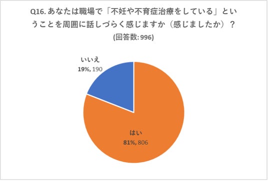 職場で「不妊や不育症治療をしている」ということを周囲に話している人は65%(Q15)。一方、職場で「不妊や不育症治療をしている」ということを周囲に話しづらく感じている人は81%だった(Q16)。