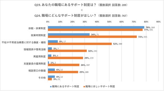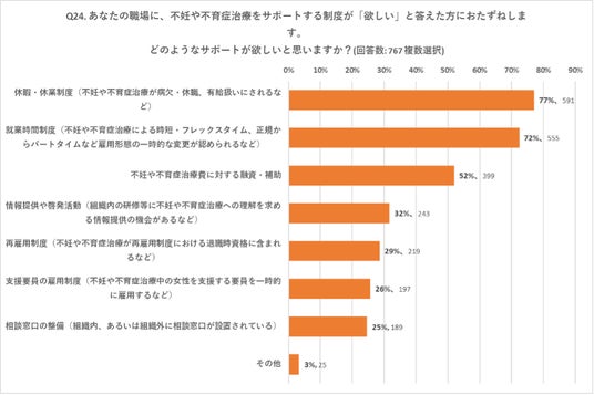 不妊や不育症治療をサポートする制度で職場に望むことは、「休暇・休業制度(不妊や不育症治療が病欠・休職、有給扱いにされるなど)」(77%)が最も多く、続いて「就業時間制度(不妊や不育症治療による時短・フレックスタイム、正規からパートタイムなど雇用形態の一時的な変更が認められるなど)」(72%)、「不妊や不育症治療費に対する融資・補助」(52%)であった(Q24)。(図19~図21参照)