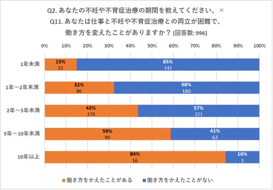 仕事と不妊や不育症治療との両立が困難で働き方を変えたことの有無を、不妊や不育症治療の期間別で見てみると、働き方を変えたことがある人の治療期間で最も多かったのは「10年以上」(84%)、次に「5年~10年未満」(59%)、「2年~5年未満」(43%)。働き方を変えたことがない人の治療期間で最も多かったのは「1年未満」(85%)、続いて「1年~2年未満 」(68%)、「2年~5年未満」(57%)(Q2×Q11)。